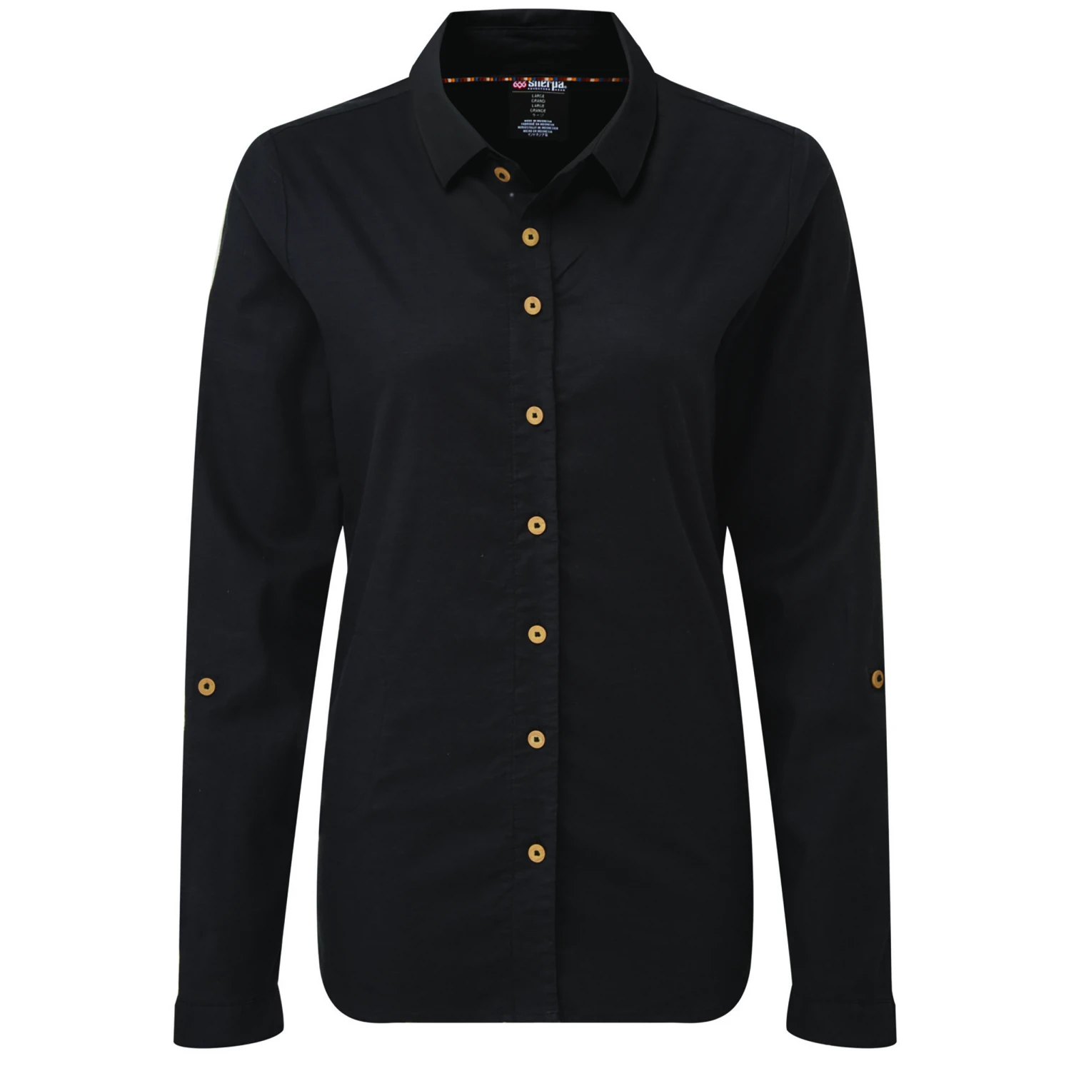 - Die Ärmel können hochgekrempelt und mit einem Knopfverschluss befestigt werden.